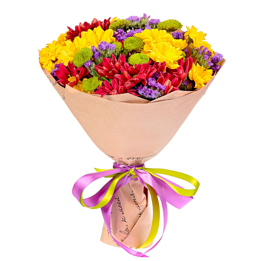 На фото представлен образец. Объем букета зависит от выбранного вами размера. Точное количество цветов и цветовую гамму вы можете уточнить у менеджера по телефону.