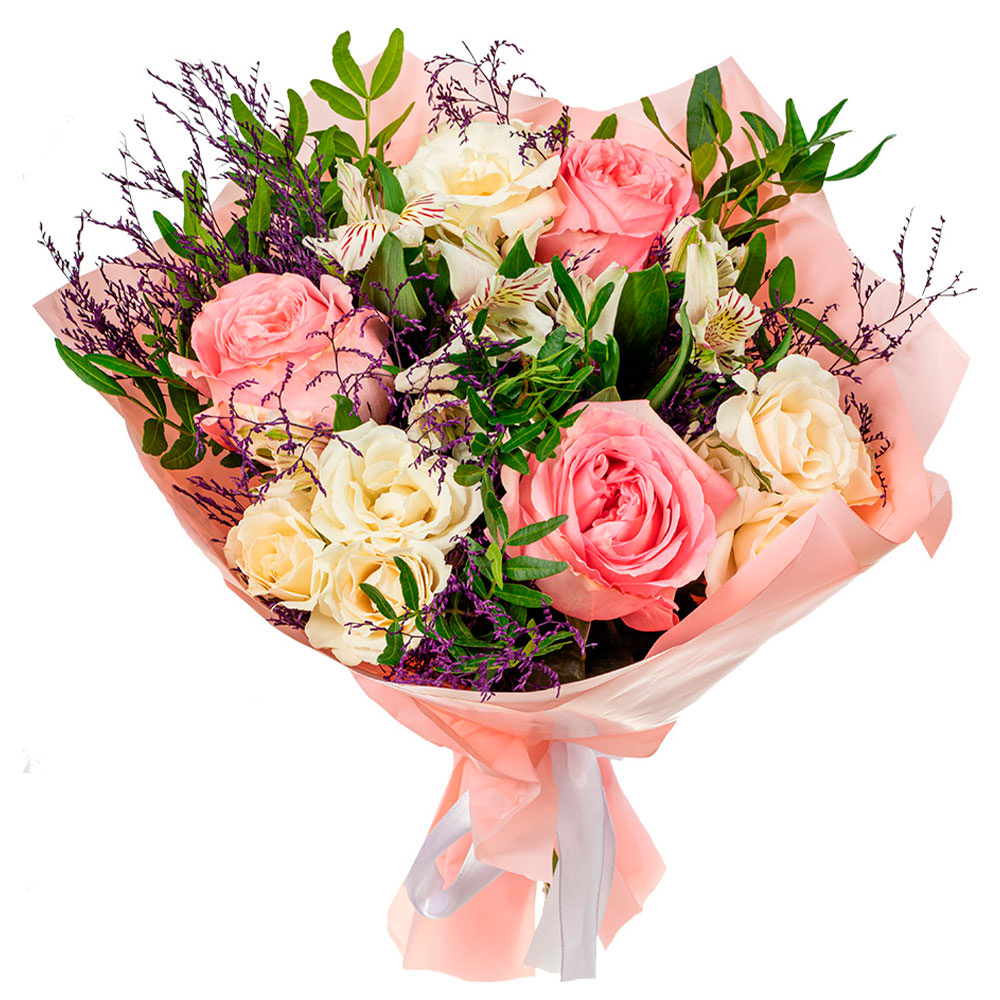 На фото представлен образец. Объем букета зависит от выбранного вами размера. Точное количество цветов и цветовую гамму вы можете уточнить у менеджера по телефону.
