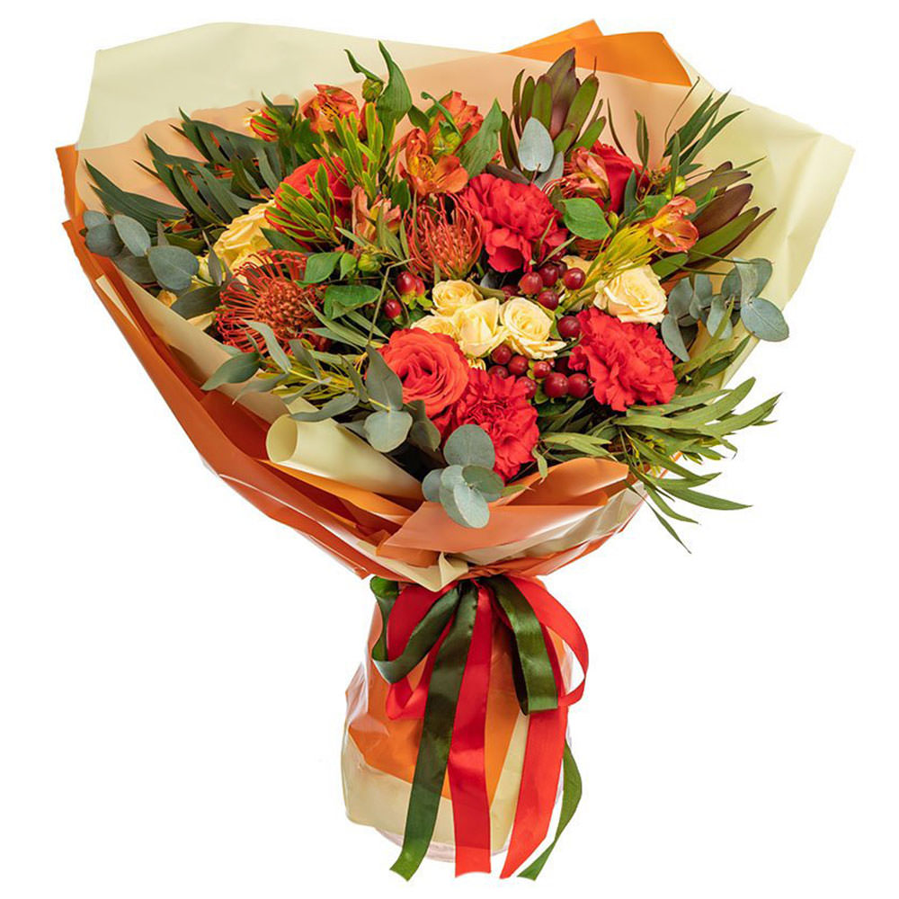 На фото представлен образец. Объем букета зависит от выбранного вами размера. Точное количество цветов и цветовую гамму вы можете уточнить у менеджера по телефону.