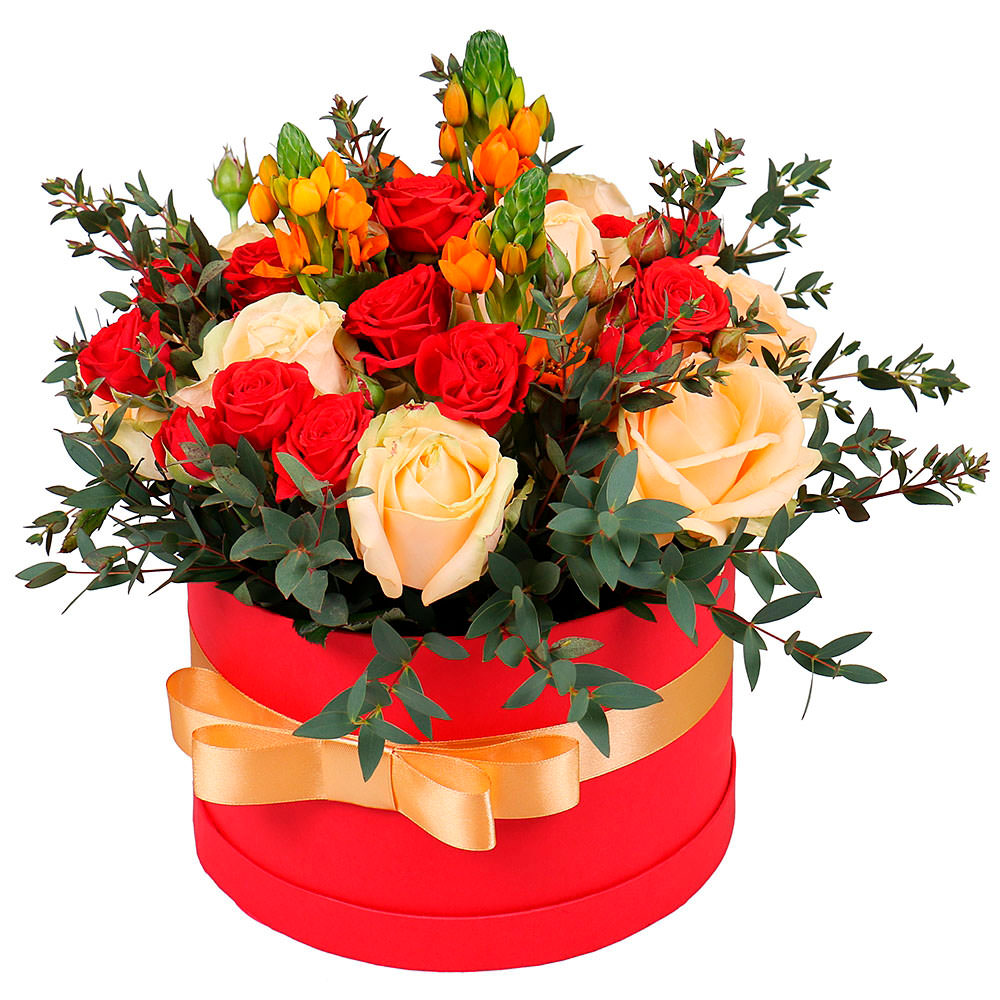 На фото представлен образец. Объем коробки зависит от выбранного вами размера. Точное количество цветов и цветовую гамму вы можете уточнить у менеджера по телефону.